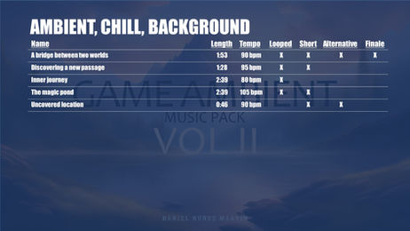 Game Ambient Music Pack Vol. III is a high-quality original music designed for royalty-free use un video games. With 16 tracks, over 24 minutes of music and 6 unique tracks, it offers a value collection of inspiring and ambient music. All at an affordable price. Take your project to the next level.