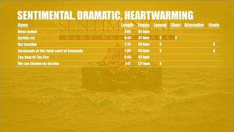Sentimental Music: Designed to tug at players' heartstrings, featuring highly emotional and dramatic orchestral music. This music is suitable for trailers or games of adventure, RPGs, and visual novels, allowing players to fully immerse themselves in the drama.